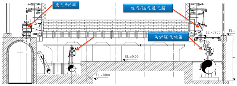 廢氣開閉器及煙道布置在焦?fàn)t焦側(cè),混合煤氣及空氣導(dǎo)入裝置布置在焦?fàn)t機(jī)側(cè),便于調(diào)節(jié)從機(jī)側(cè)到焦側(cè)各立火道煤氣流和空氣流,且便于廢氣流的排出,有利于焦?fàn)t長向加熱的均勻性。